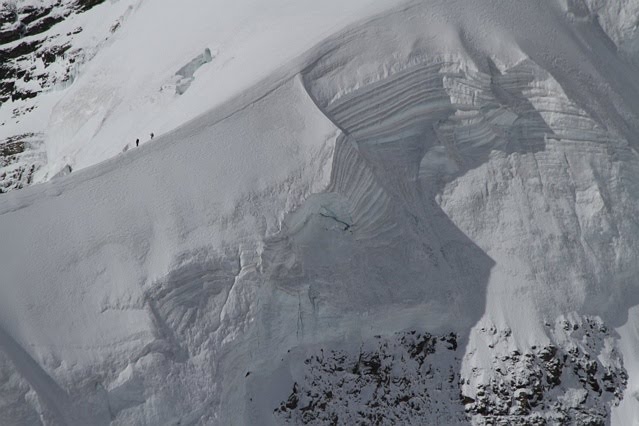 Scorgiamo gruppi di scalatori fra il bianco accecante di crepacci e serracchi. Il nostro sguardo è attratto in direzione dei tonfi di potenti slavine che giungono ai nostri orecchi dopo alcuni secondi dal distacco, a causa della velocità del suono limitata rispetto alle distanze. Ciò ci impedisce di vedere l'inizio del manifestarsi di questi imponenti fenomeni.